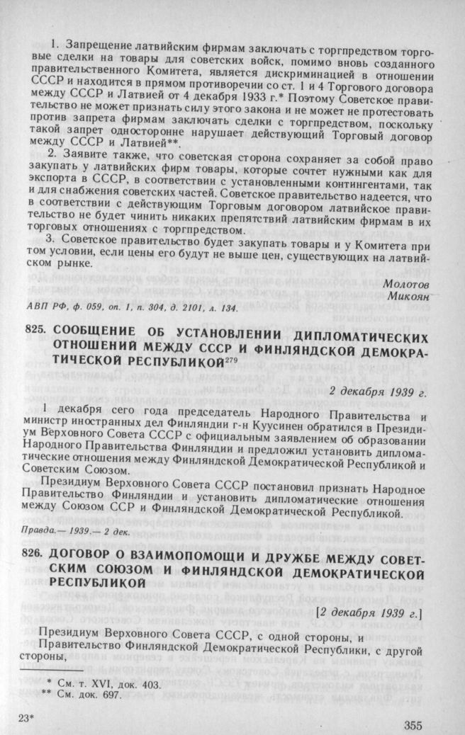 Сообщение об установлении дипломатических отношений между СССР и Финляндской Демократической Республикой. 2 декабря 1939 г. // Правда. 1939. 2 декабря.