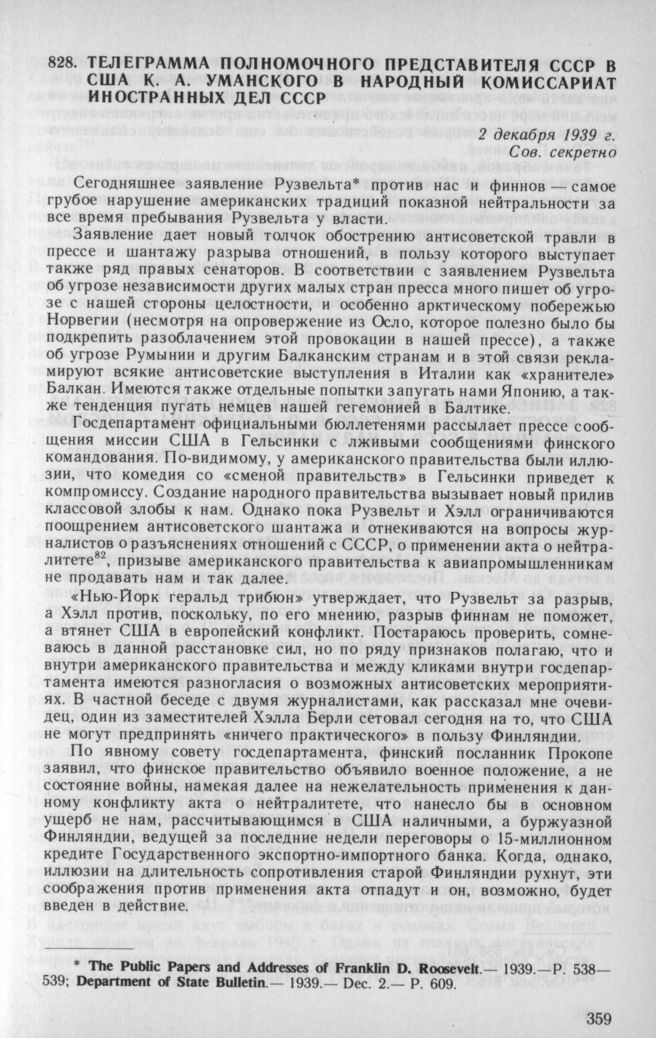 Телеграмма полномочного представителя СССР в США К. А. Уманского в Народный комиссариат иностранных дел СССР. 2 декабря 1939 г. // АВП РФ, ф. 059, oп. 1, п. 296. д. 2049, л. 166—169.