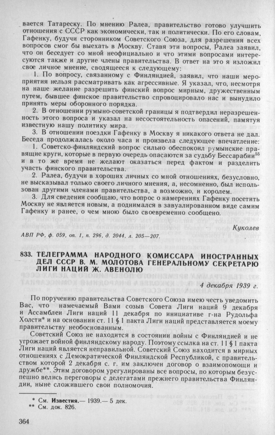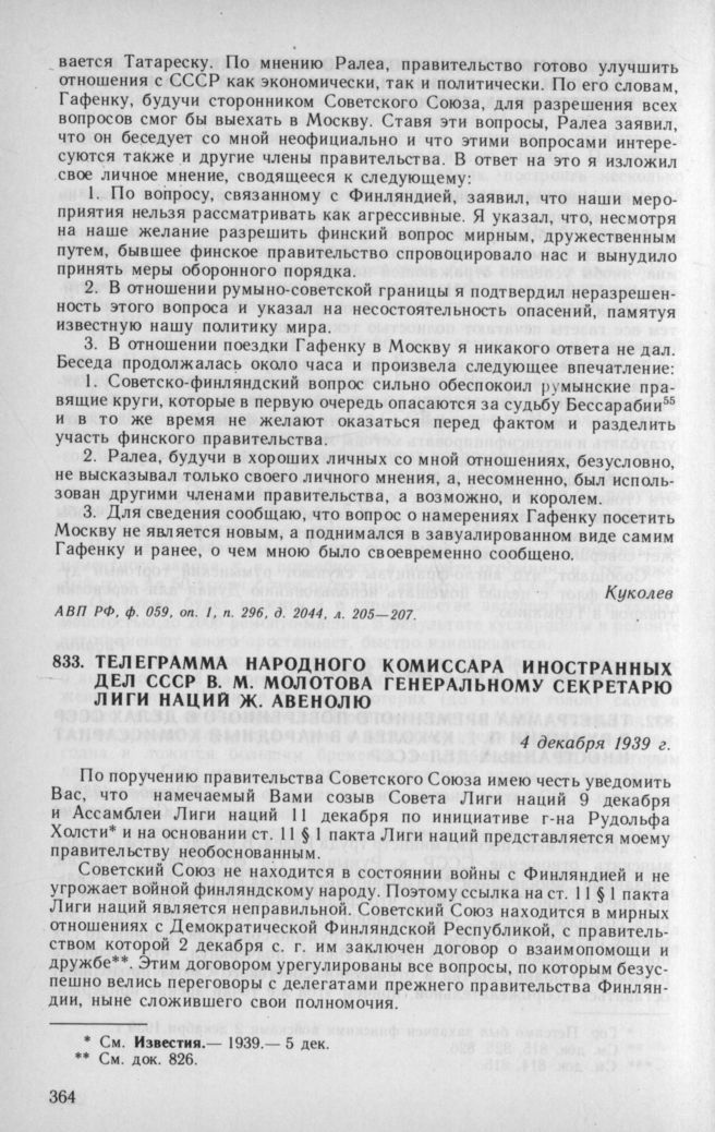 Телеграмма народного комиссара иностранных дел СССР В. М. Молотова генеральному секретарю Лиги наций Ж. Авенолю. 4 декабря 1939 г. // АВП РФ, ф. 06, oп. 1, п. 3, д. 23, л. 70—71.; Известия. 1939. 5 декабря.