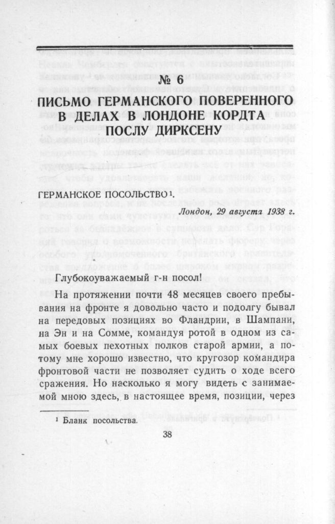 Письмо германского поверенного в делах в Лондоне Кордта послу Дирксену от 29 августа 1938 г.