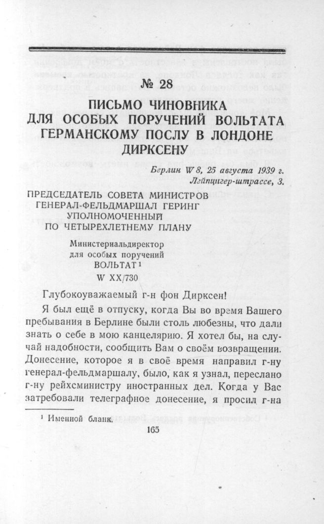 Письмо чиновника для особых поручений Вольтата германскому послу в Лондоне Дирксену от 25 августа 1939 г.