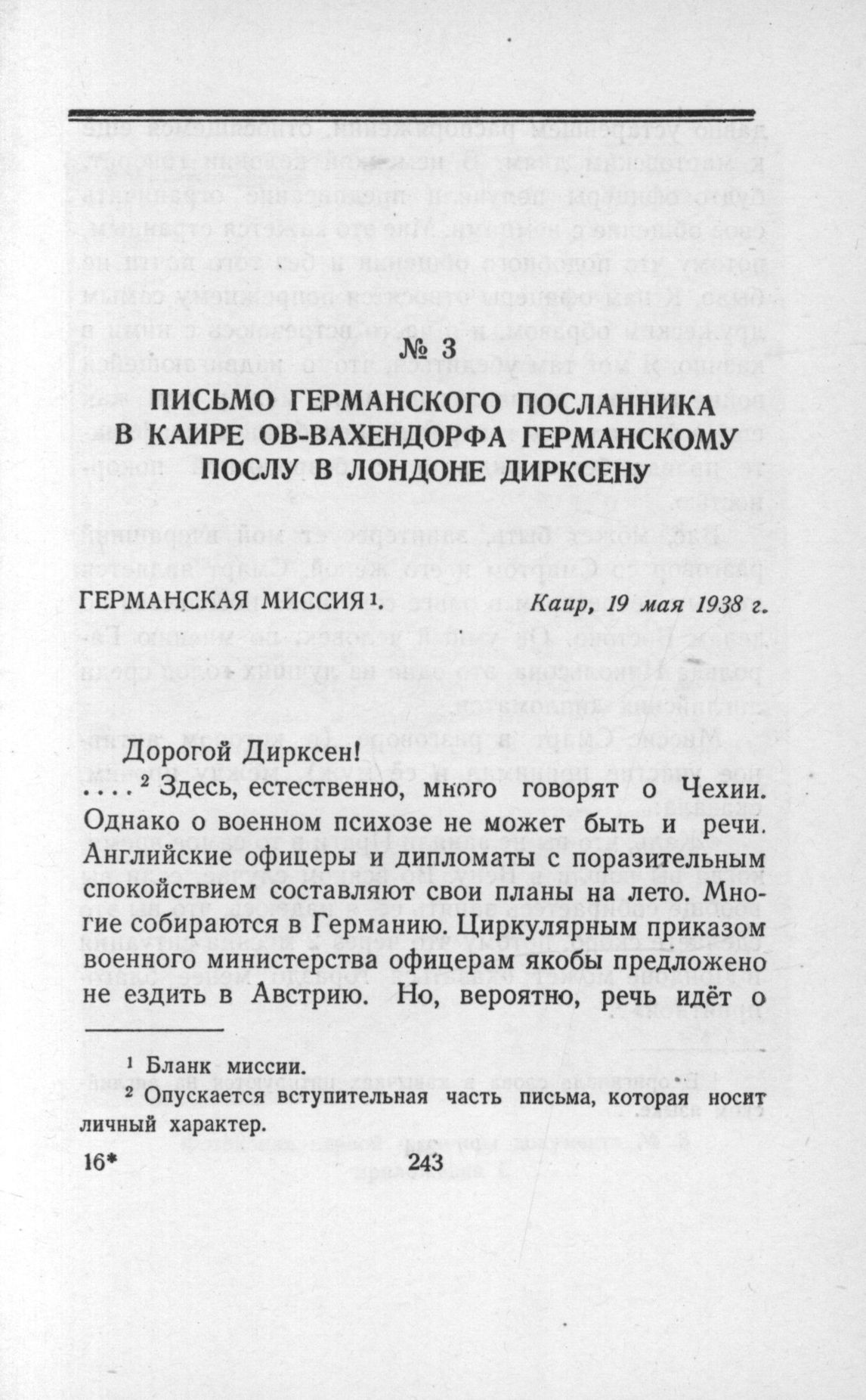 Письмо германского посланника в Каире Ов-Вахендорфа германскому послу в Лондоне Дирксену от 19 мая 1938 г.
