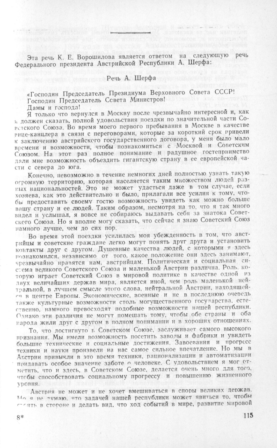 Речь Федерального президента Австрийской Республики А. Шерфа на приеме в посольстве Австрийской Республики в Москве 13 октября 1959 г. // Печат. по газ. «Известия», 14 октября 1959 г.