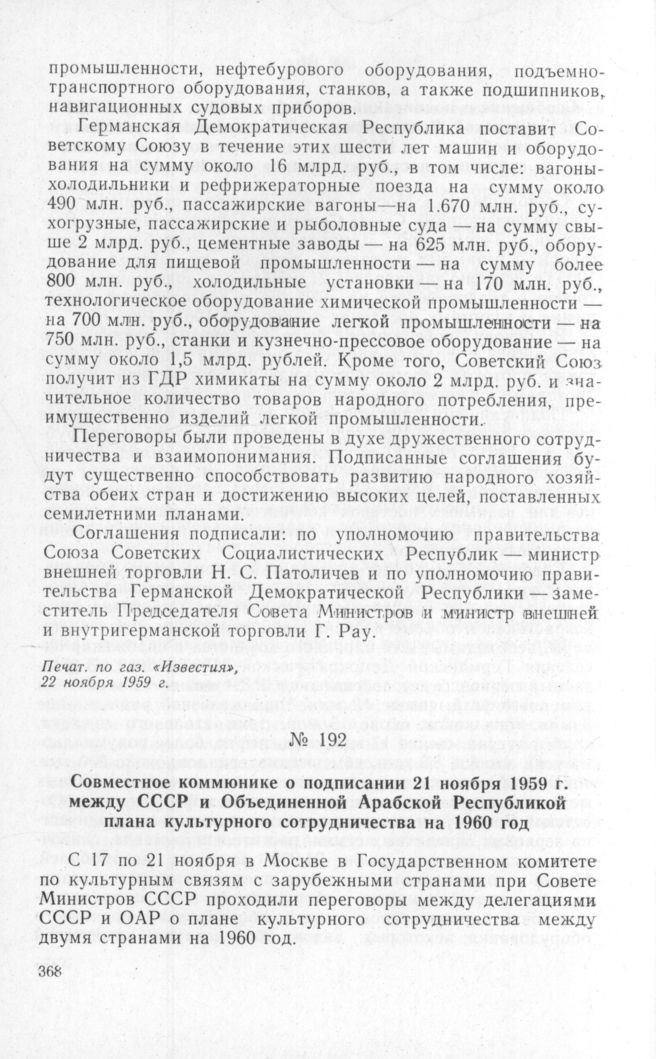 Совместное коммюнике о подписании 21 ноября 1959 г. между СССР и Объединенной Арабской Республикой плана культурного сотрудничества на 1960 год // Печат. по газ. «Правда», 23 ноября 1959 г.