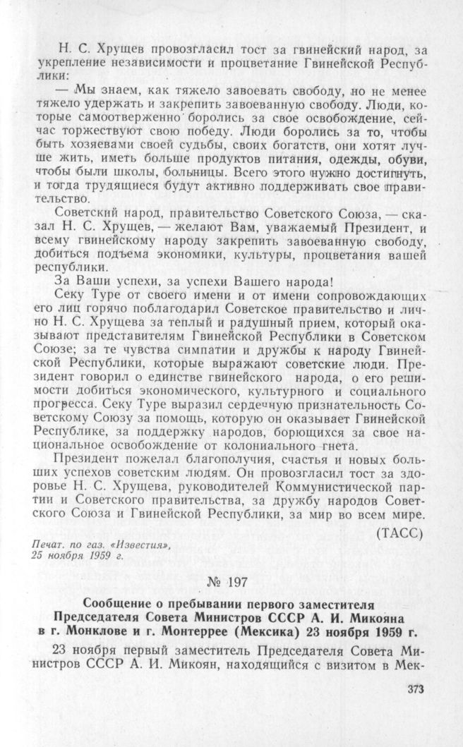 Сообщение о пребывании первого заместителя Председателя Совета Министров СССР А. И. Микояна в г. Монклове и г. Монтеррее (Мексика) 23 ноября 1959 г. // Печат. по газ. «Известия», 25 ноября 1959 г.