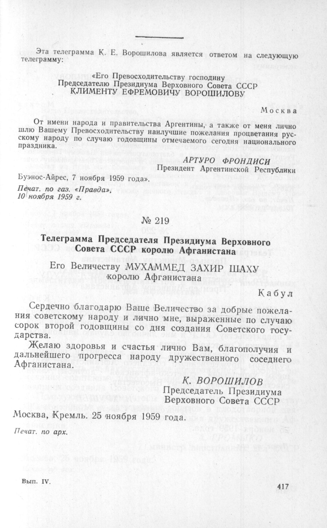 Телеграмма Президента Аргентинской Республики Председателю Президиума Верховного Совета СССР. 7 ноября 1959 г. // Печат. по газ. «Правда». 10 ноября 1959 г.