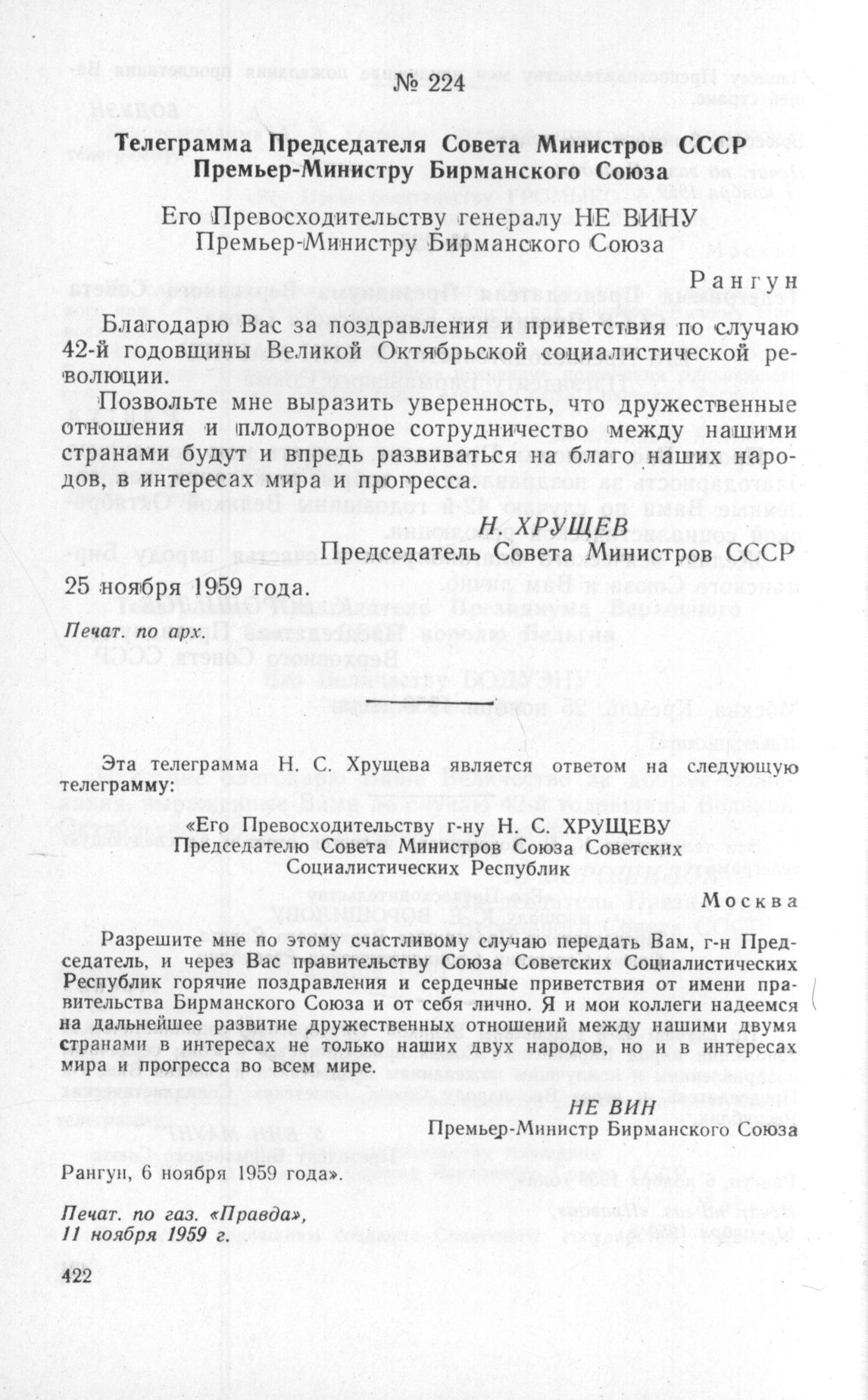 Телеграмма Премьер-Министра Бирманского Союза Председателю Совета Министров СССР. 6 ноября 1959 г. // Печат. по газ. «Правда», 11 ноября 1959 г.