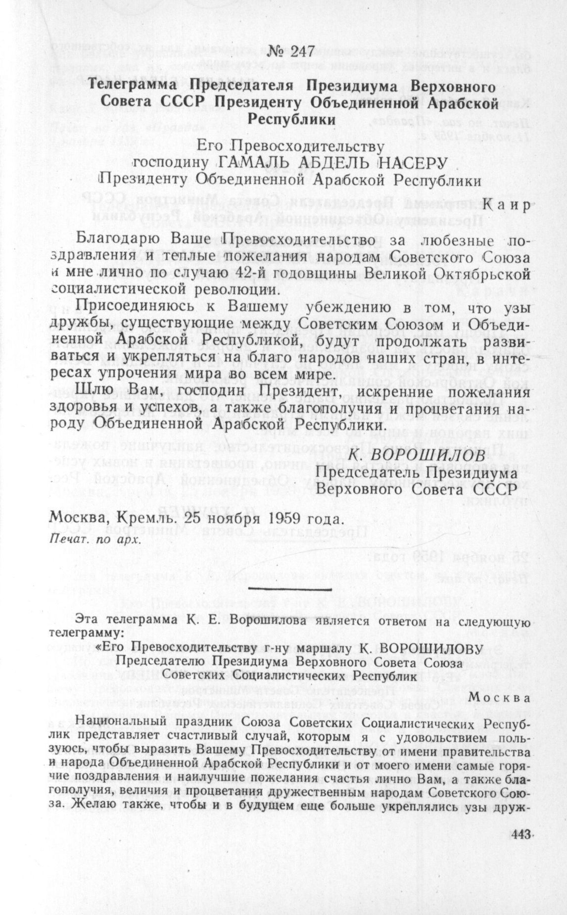 Телеграмма Президента Объединенной Арабской Республики Председателю Президиума Верховного Совета СССР. 7 ноября 1959 г. // Печат. по газ. «Правда», 11 ноября 1959 г.