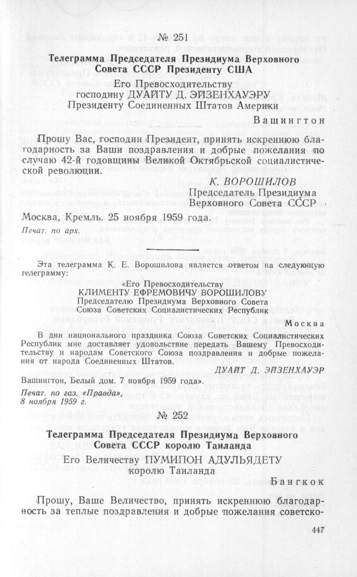 Телеграмма Председателя Президиума Верховного Совета СССР Президенту США. Москва, Кремль. 25 ноября 1959 года // Печат. по арх.
