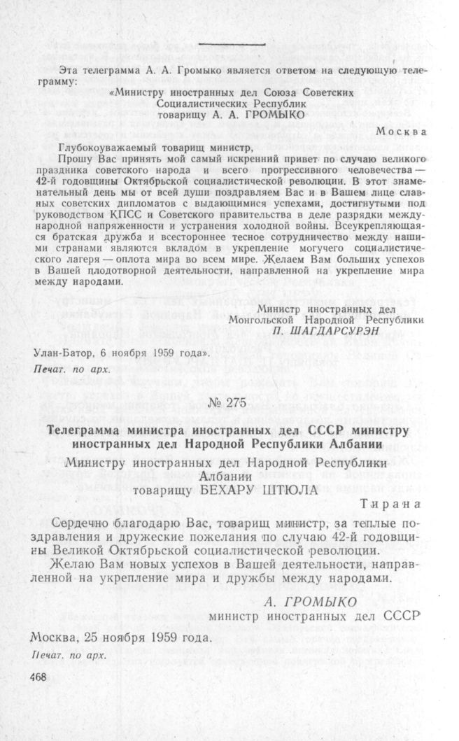Телеграмма министра иностранных дел СССР министру иностранных дел Народной Республики Албании. Москва, 25 ноября 1959 года // Печат. по арх.