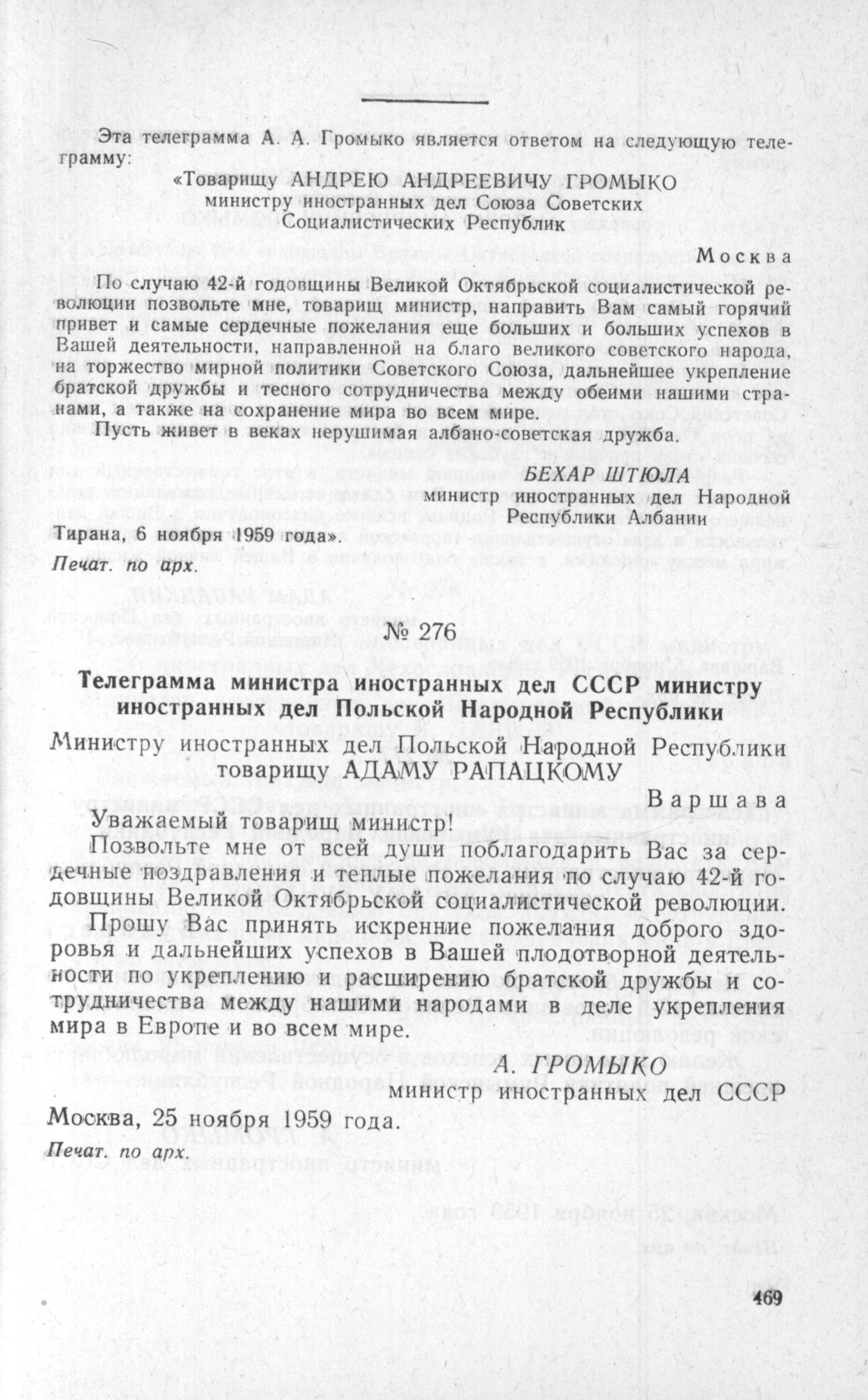 Телеграмма министра иностранных дел Народной Республики Албании министру иностранных дел СССР. 6 ноября 1959 г. // Печат. по арх.