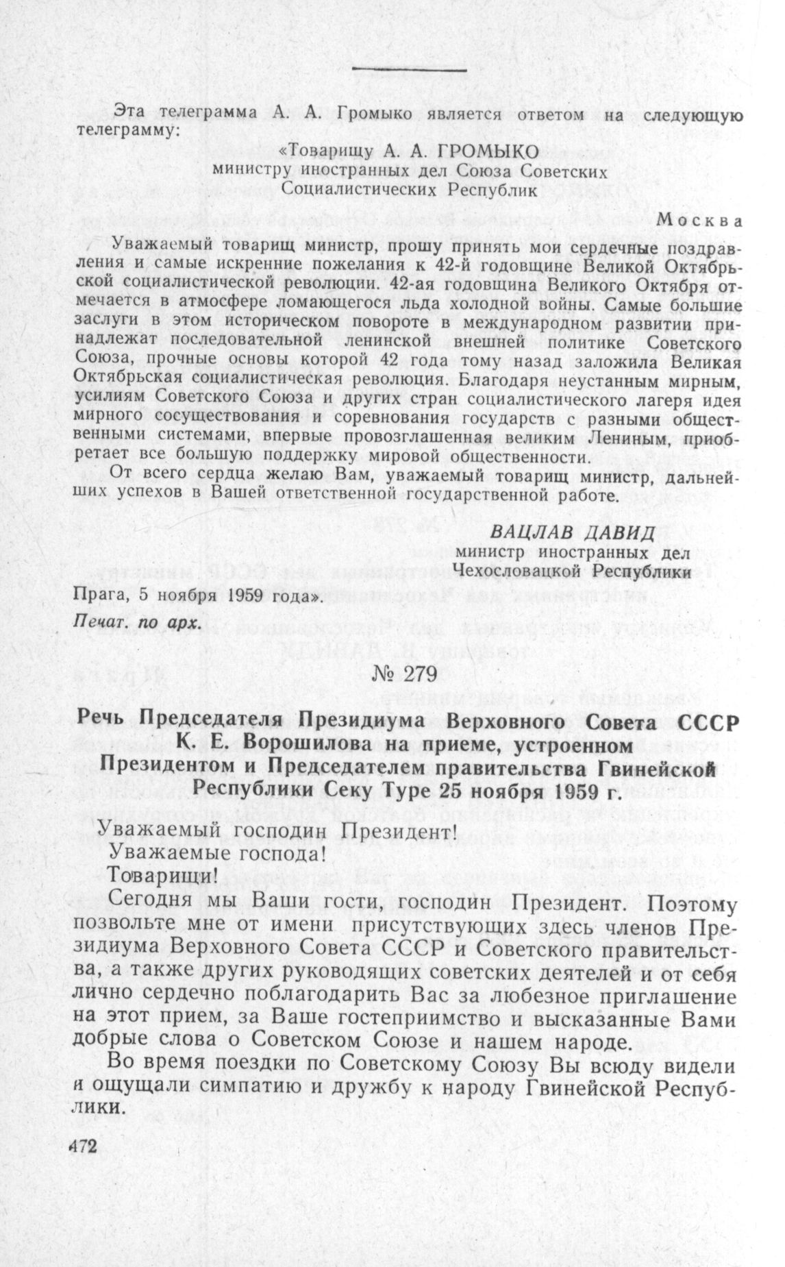 Речь Председателя Президиума Верховного Совета СССР К. Е. Ворошилова на приеме, устроенном Президентом и Председателем правительства Гвинейской Республики Секу Туре 25 ноября 1959 г. // Печат. по газ. «Известия», 26 ноября 1959 г.