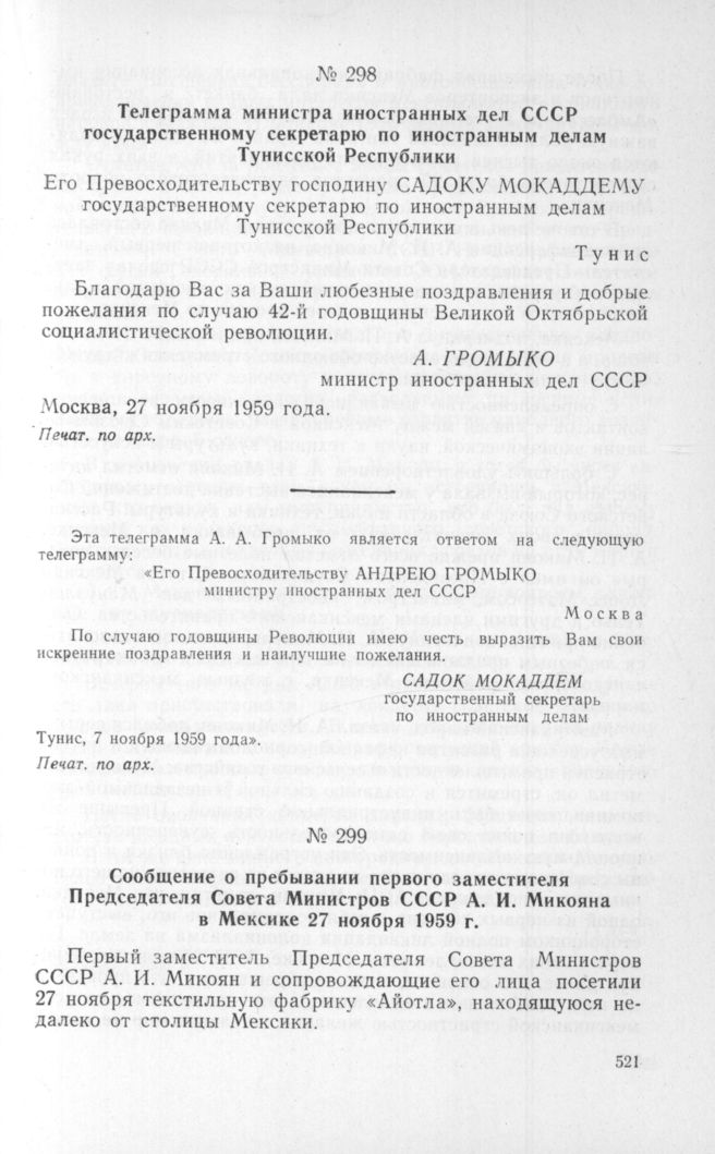 Телеграмма министра иностранных дел СССР государственному секретарю по иностранным делам Тунисской Республики. Москва, 27 ноября 1959 года