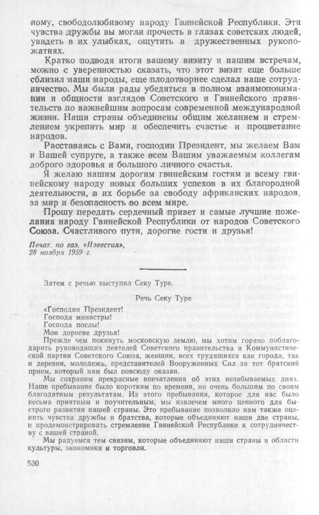 Речь Президента и Председателя правительства Гвинейской Республики Секу Туре при отъезде из Москвы 27 ноября 1959 г. // Печат. по газ. «Известия», 28 ноября 1959 г.