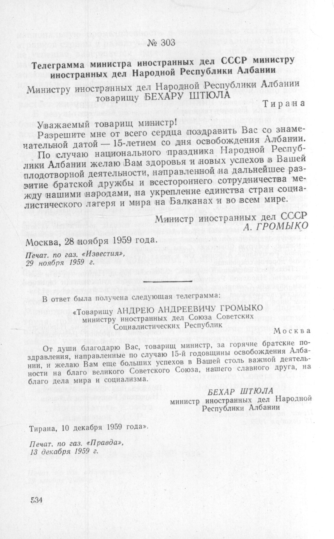 Телеграмма министра иностранных дел СССР министру иностранных дел Народной Республики Албании. Москва, 28 ноября 1959 года // Печат. по газ. «Известия», 29 ноября 1959 г.