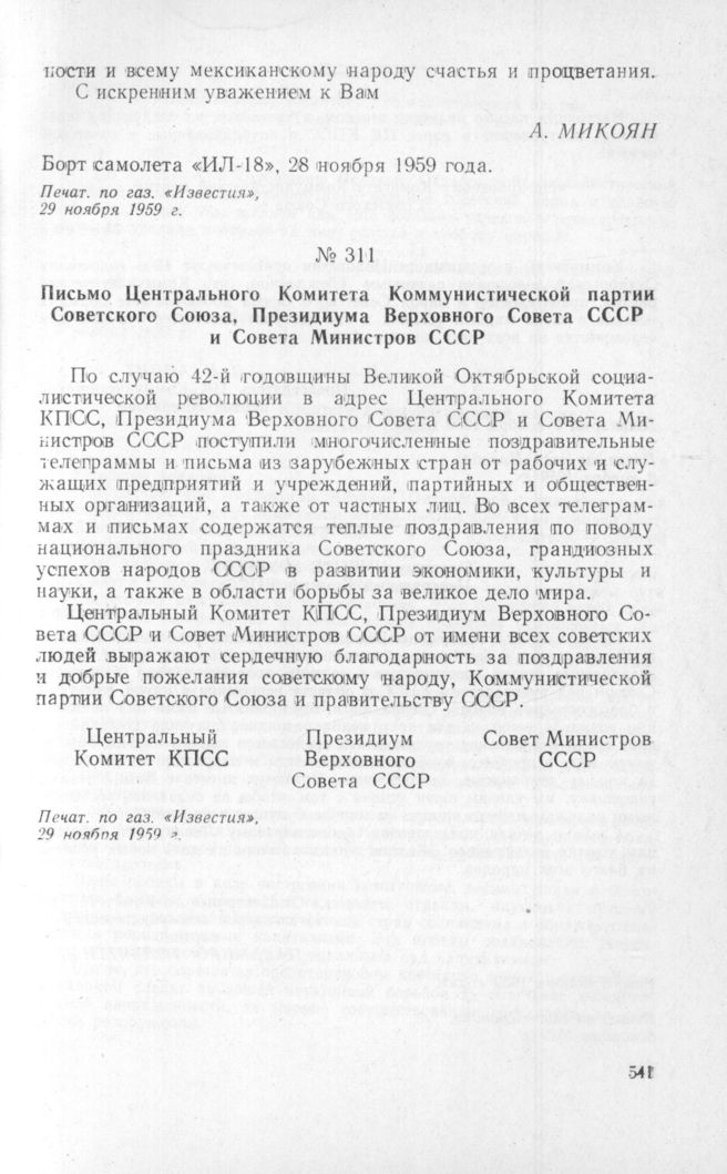 Письмо Центрального Комитета Коммунистической партии Советского Союза, Президиума Верховного Совета СССР и Совета Министров СССР // Печат. по газ. «Известия», 29 ноября 1919 г.