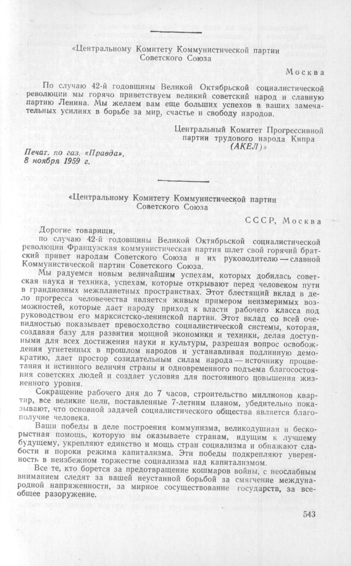 Телеграмма Центрального Комитета Прогрессивной партии трудового народа Кипра Центральному Комитету Коммунистической партии Советского Союза // Печат. по газ. «Правда», 8 ноября 1959 г.
