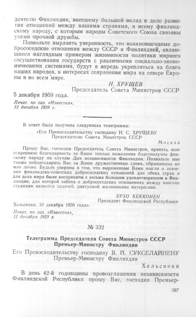 Телеграмма Председателя Совета Министров СССР Премьер-Министру Финляндии. 5 декабря 1959 года // Печат. по газ. «Известия», 12 декабря 1959 г.