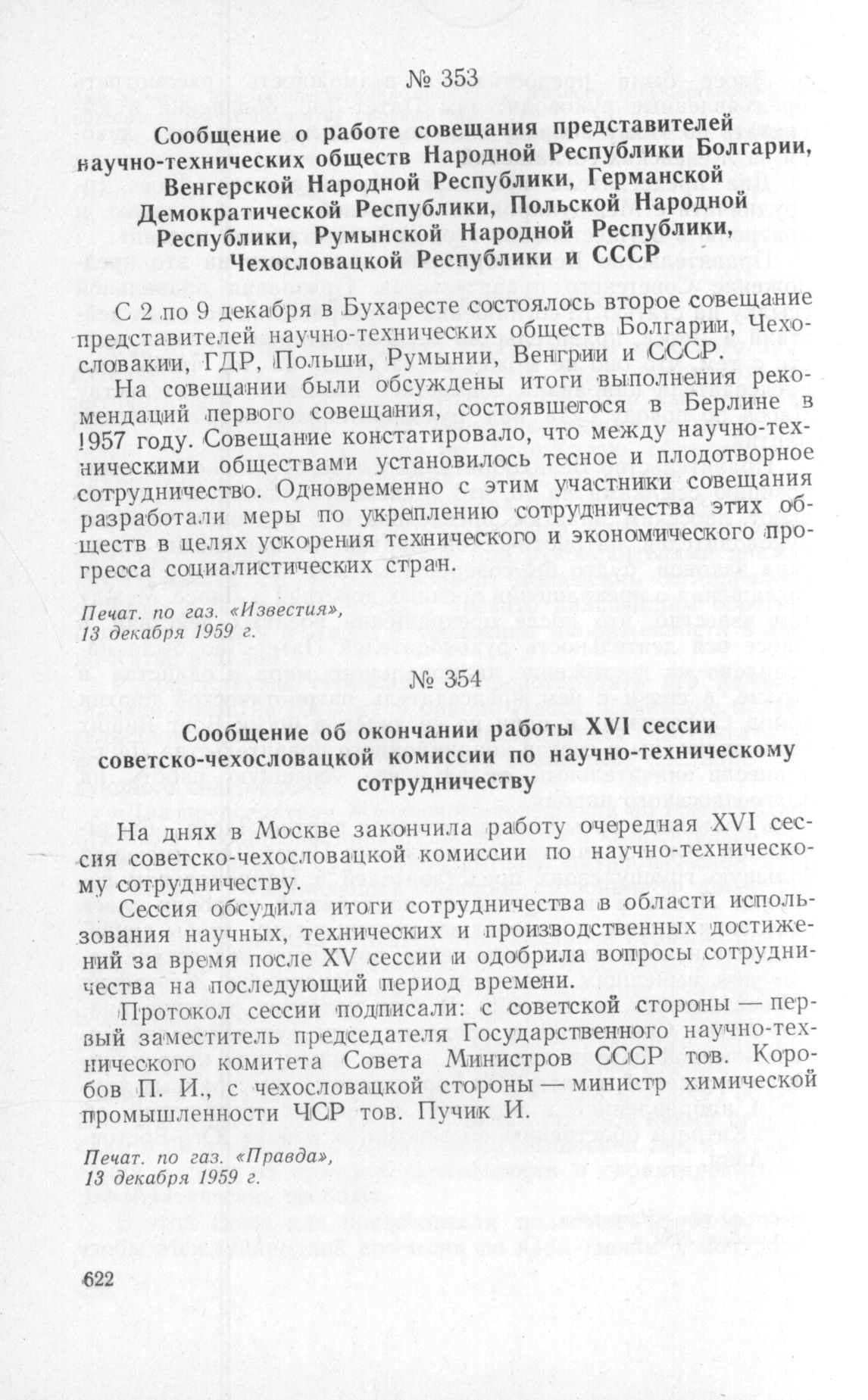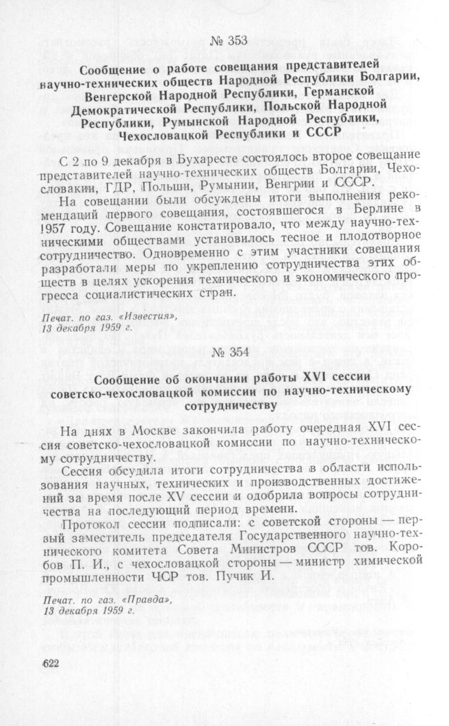 Сообщение об окончании работы XVI сессии советско-чехословацкой комиссии по научно-техническому сотрудничеству // Печат. по газ. «Правда», 13 декабря 1959 г.