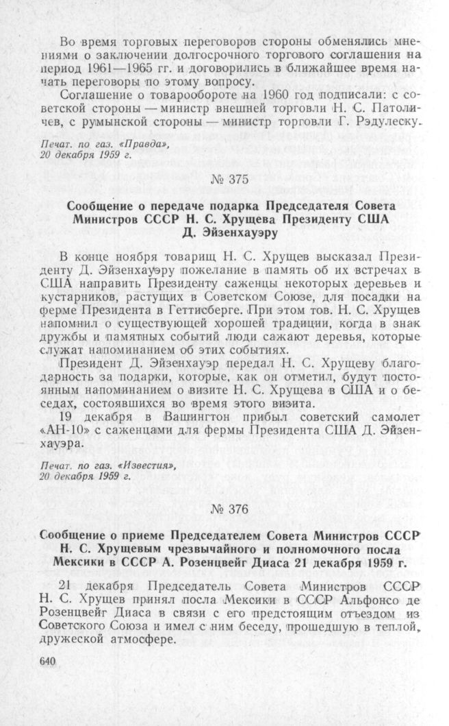 Сообщение о передаче подарка Председателя Совета Министров СССР Н. С. Хрущева Президенту США Д. Эйзенхауэру // Печат. по газ. «Известия», 20 декабря 1959 г.