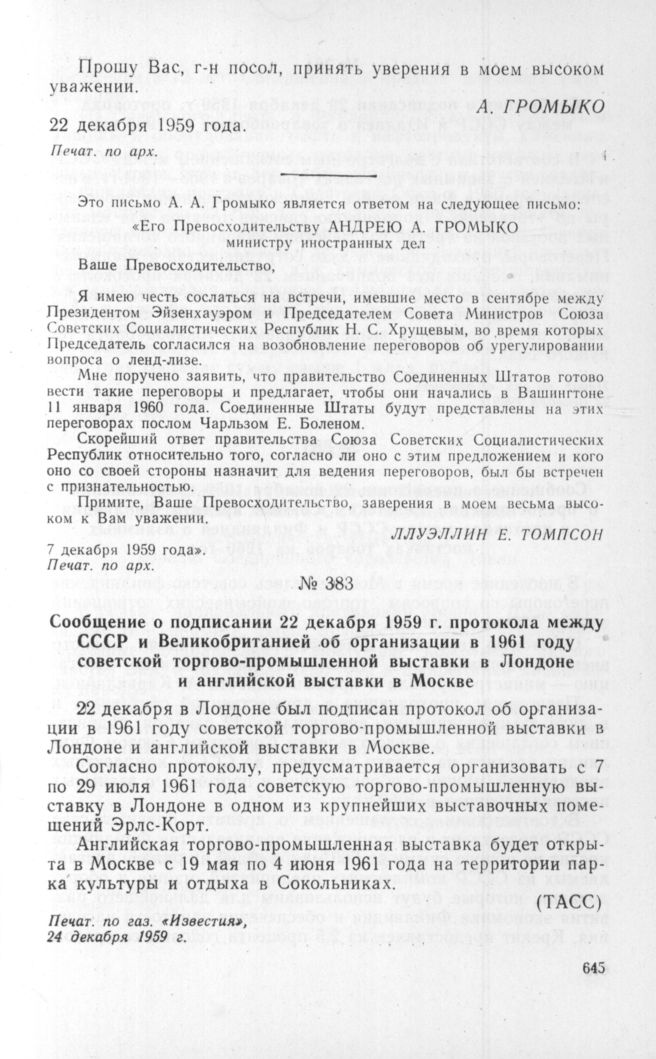 Письмо чрезвычайного и полномочного посла США в СССР министру иностранных дел СССР. 7 декабря 1959 г. // Печат. по арх.