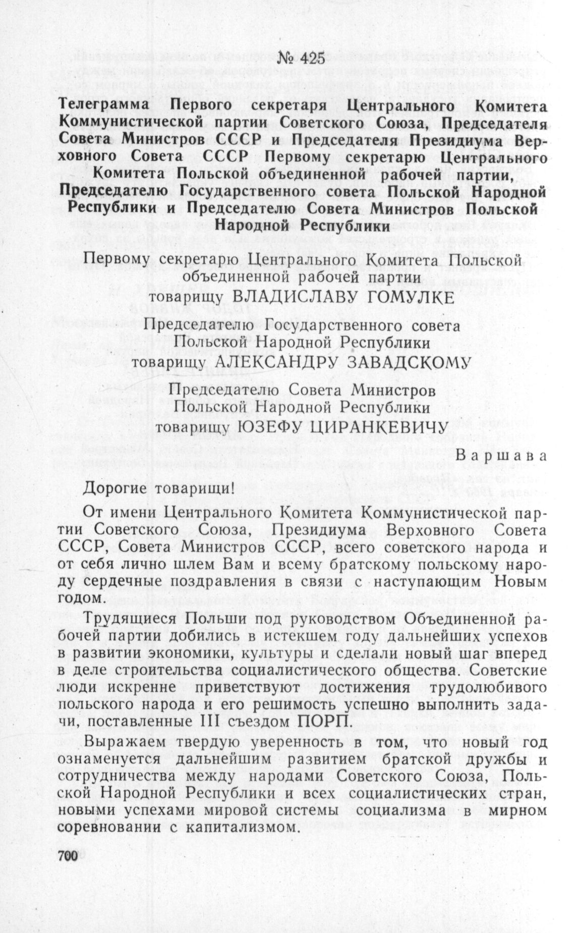 Телеграмма Первого секретаря Центрального Комитета Коммунистической партии Советского Союза, Председателя Совета Министров СССР и Председателя Президиума Верховного Совета СССР Первому секретарю Центрального Комитета Польской объединенной рабочей партии, Председателю Государственного совета Польской Народной Республики и Председателю Совета Министров Польской Народной Республики. Москва, Кремль. 31 декабря 1959 года // Печат. по газ. «Правда», 2 января 1960 г.
