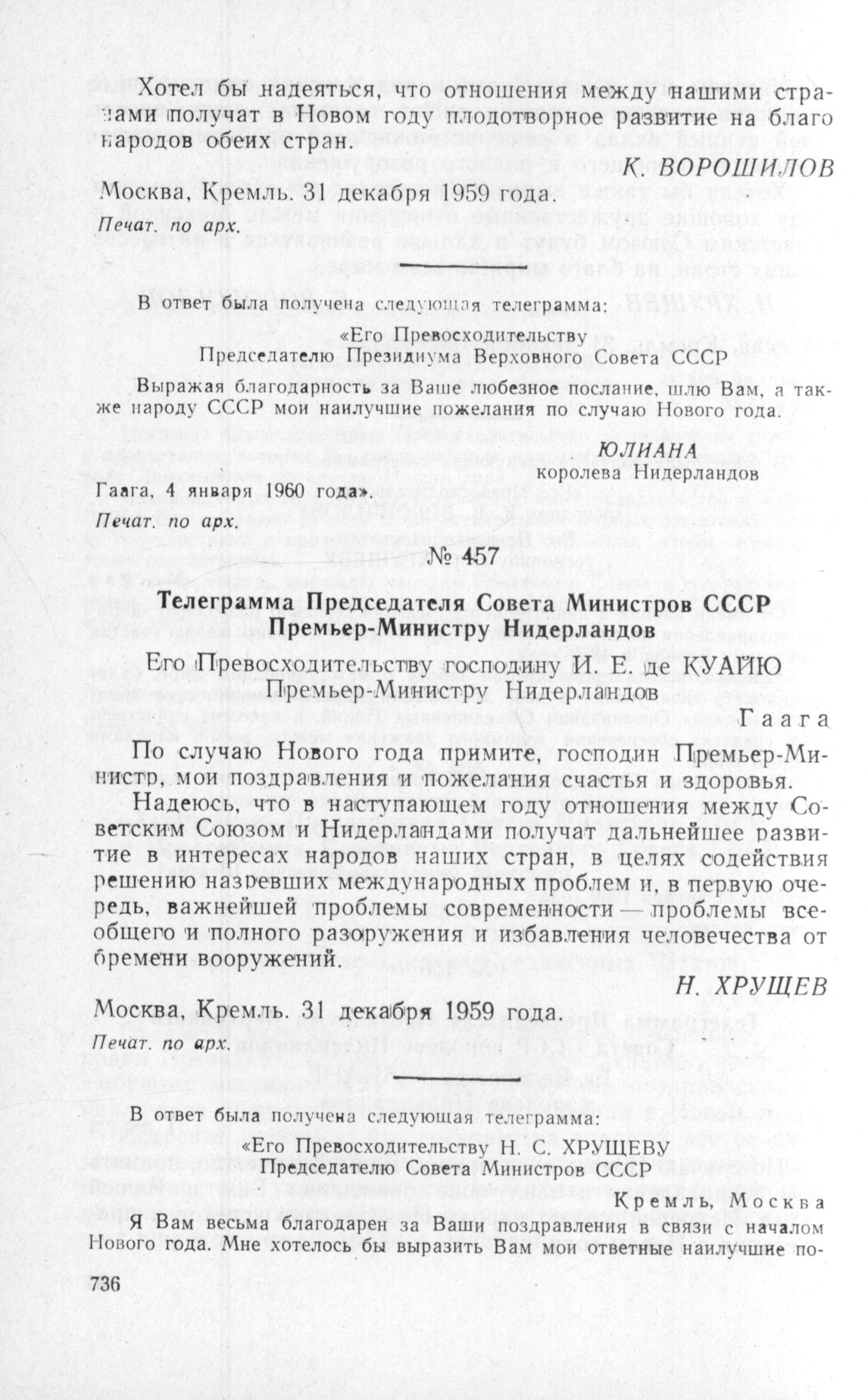 Телеграмма Премьер-Министра Нидерландов Председателю Совета Министров СССР. 6 января 1960 г. // Печат. по арх.