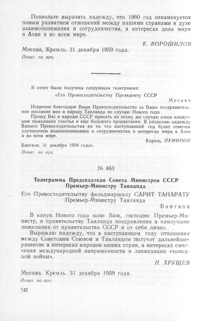 Телеграмма короля Таиланда Председателю Президиума Верховного Совета СССР. 31 декабря 1959 г. // Печат. по арх.