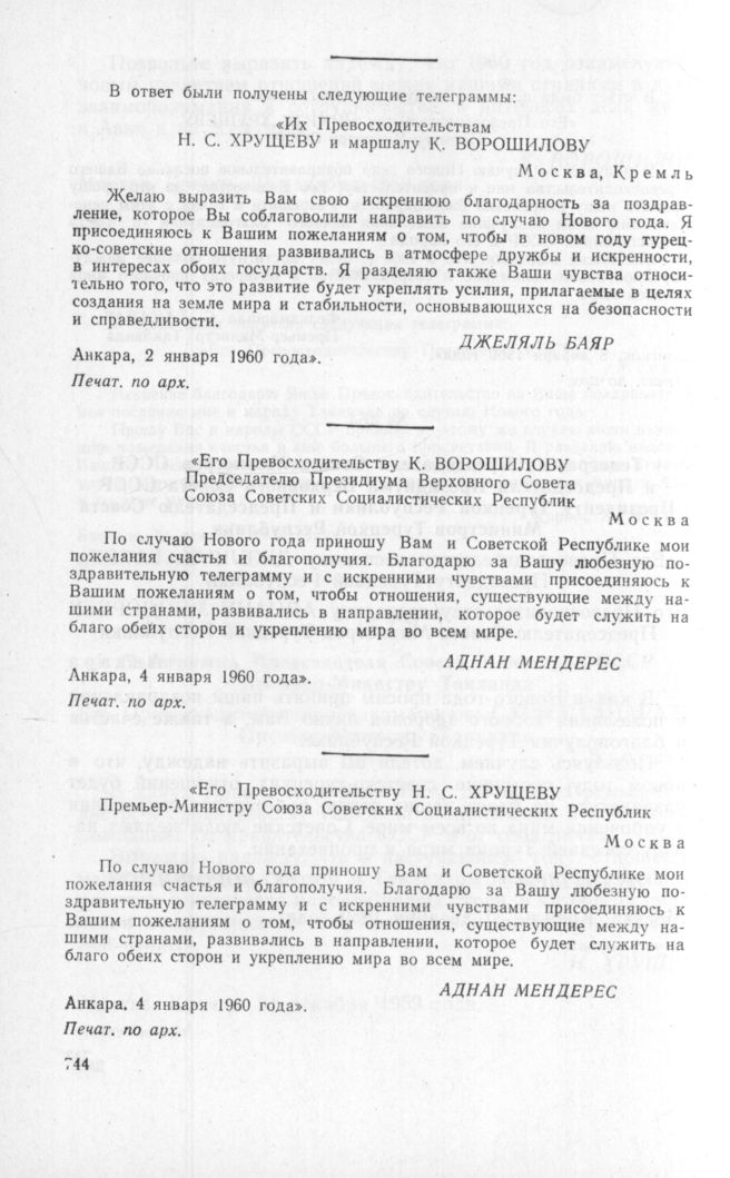 Телеграмма Председателя Совета Министров Турецкой Республики Председателю Совета Министров СССР. 4 января 1960 г. // Печат. по арх.