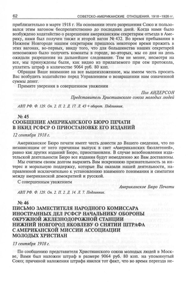 Письмо заместителя народного комиссара иностранных дел РСФСР начальнику обороны Окружной железнодорожной станции Нижний Новгород Яковлеву о снятии штрафа с американской миссии Ассоциации молодых христиан. 13 сентября 1918 г. // АВП РФ. Ф. 129. Oп. 2. П. 2. Д. 17. Л. 45. Копия.