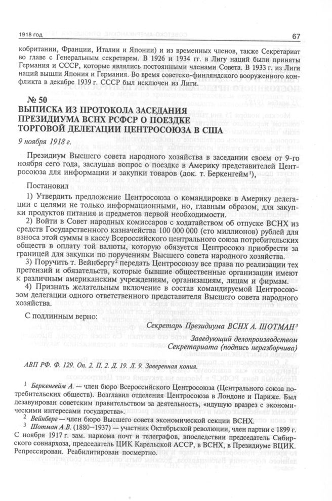 Выписка из протокола заседания Президиума ВСНХ РСФСР о поездке торговой делегации Центросоюза в США. 9 ноября 1918 г. // АВП РФ. Ф. 129. Oп. 2. П. 2. Д. 19. Л. 9. Заверенная копия.