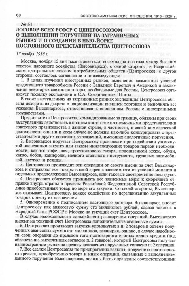 Договор ВСНХ РСФСР с Центросоюзом о выполнении поручений на загра­ничных рынках и о создании в Нью-Йорке постоянного представительства Центросоюза. 15 ноября 1918 г.