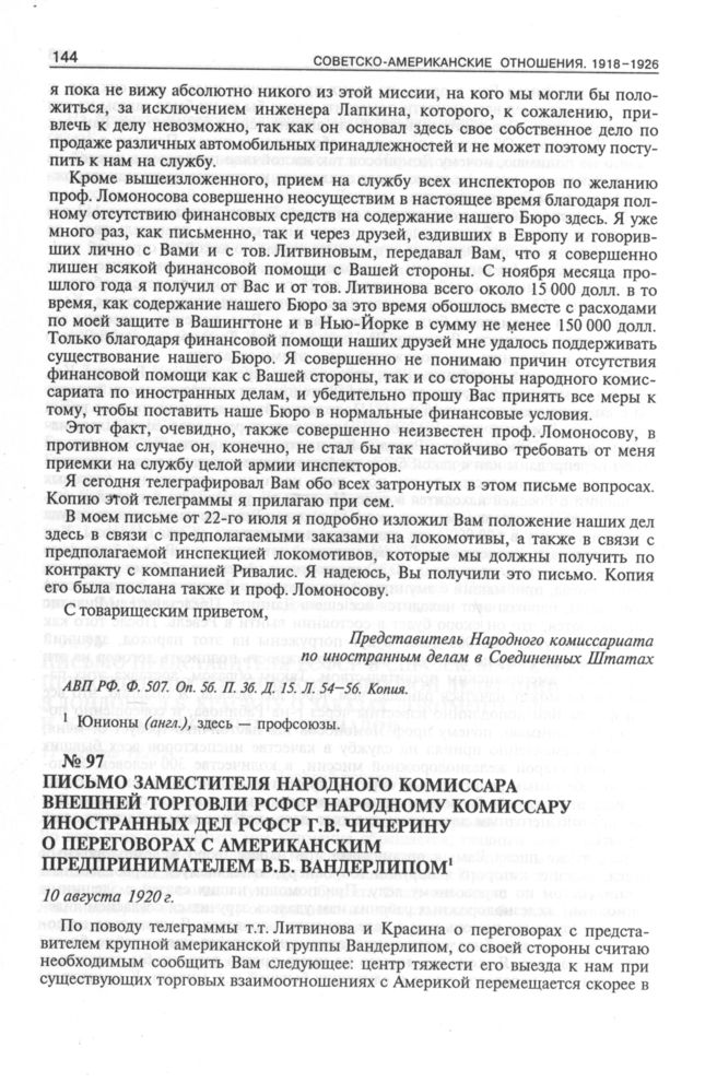 Письмо заместителя народного комиссара внешней торговли РСФСР народному комиссару иностранных дел РСФСР Г.В. Чичерину о переговорах с американским предпринимателем В.Б. Вандерлипом. 10 августа 1920 г. // АВП РФ. Ф. 4. Oп. 3. П. 8. Д. 125. Л. 10. Копия.
