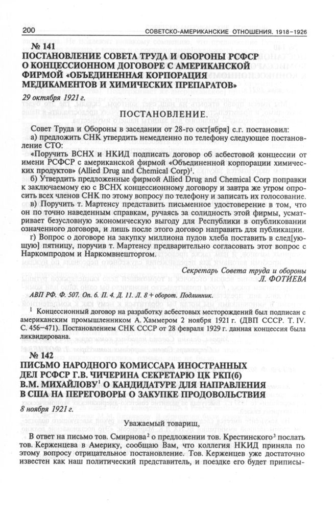 Постановление Совета труда и обороны РСФСР о концессионном договоре с американской фирмой «Объединенная корпорация медикаментов и химических препаратов». 29 октября 1921 г.