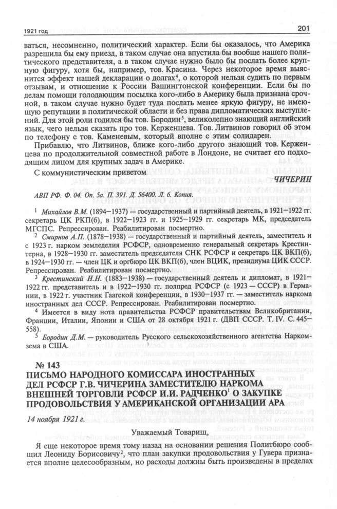 Письмо народного комиссара иностранных дел РСФСР Г.В. Чичерина заместителю наркома внешней торговли РСФСР И.И. Радченко о закупке продовольствия у американской организации АРА. 14 ноября 1921 г. // АВП РФ. Ф. 04. Oп. 58. П. 367. Д. 56059. Л. 192. Копия.