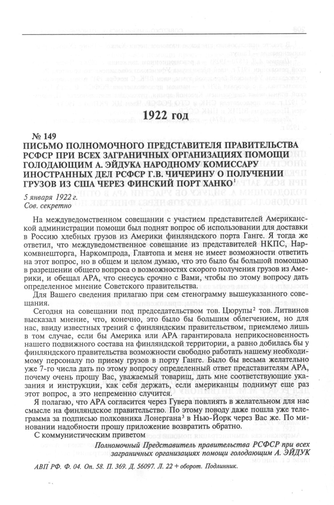 Письмо полномочного представителя правительства РСФСР при всех заграничных организациях помощи голодающим А. Эйдука народному комиссару иностранных дел РСФСР Г.В. Чичерину о получении грузов из США через финский порт Ханко. 5 января 1922 г. // АВП РФ. Ф. 04. Oп. 58. П. 369. Д. 56097. Л. 22 + оборот. Подлинник.