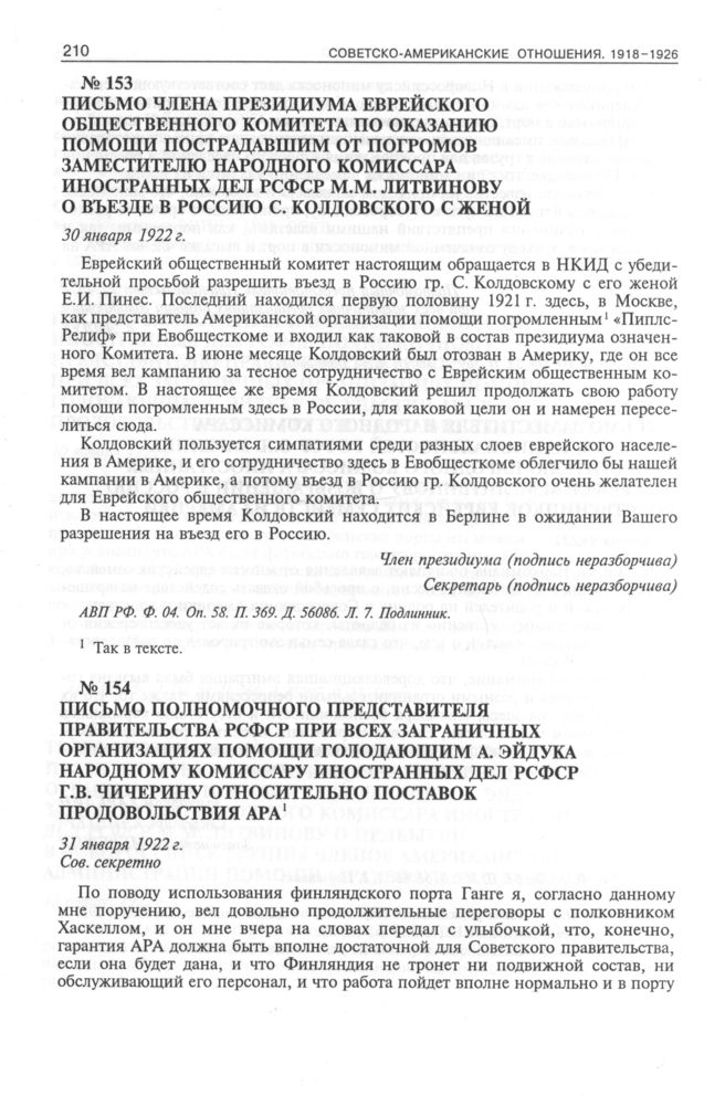 Письмо полномочного представителя правительства РСФСР при всех заграничных организациях помощи голодающим А. Эйдука народному комиссару иностранных дел РСФСР Г. В. Чичерину относительно поставок продовольствия АРА. 31 января 1922 г. // АВП РФ. Ф. 04. Oп. 58. П. 369. Д. 56097. Л. 77, 79 + оборот.