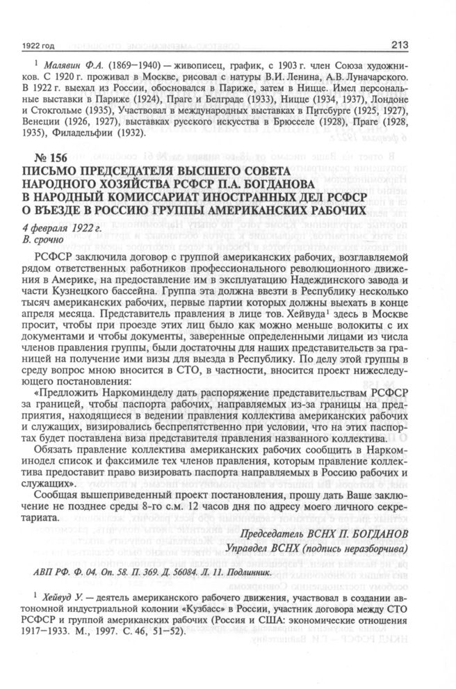 Письмо председателя Высшего совета народного хозяйства РСФСР П.А. Богданова в Народный комиссариат иностранных дел РСФСР о въезде в Россию группы американских рабочих. 4 февраля 1922 г.