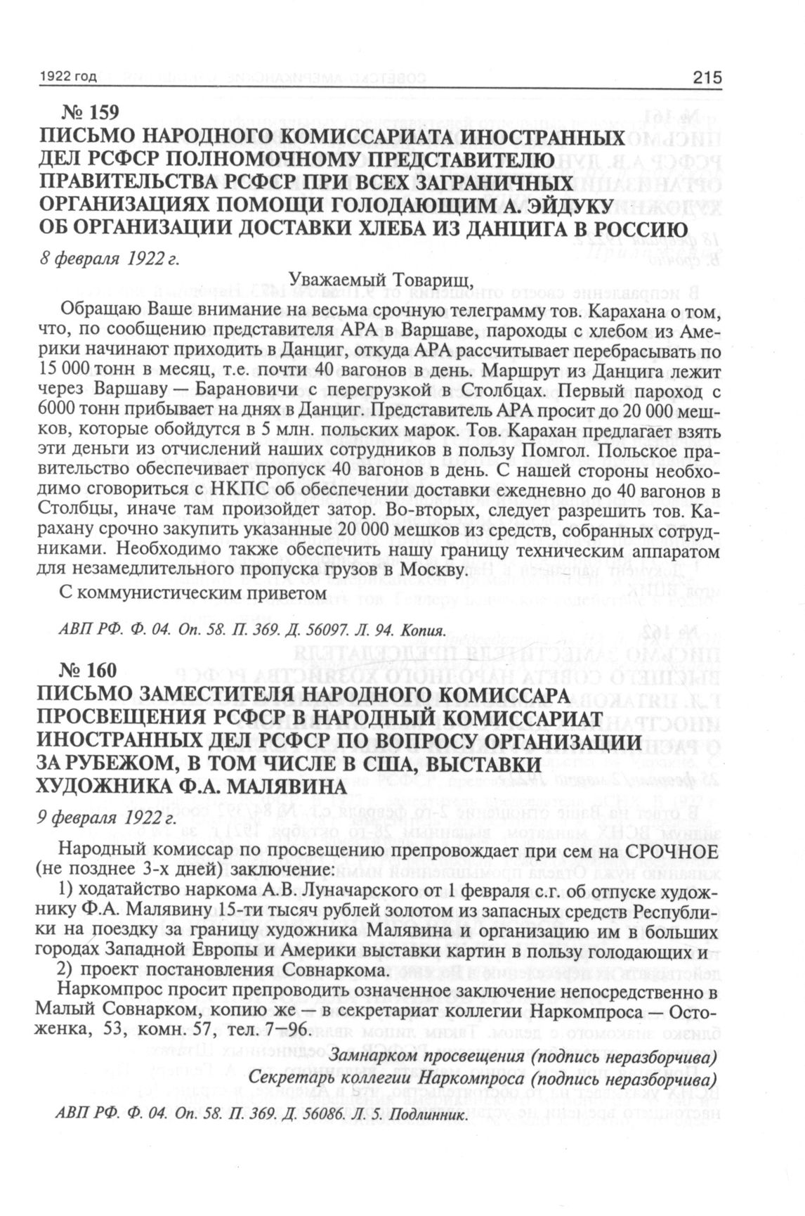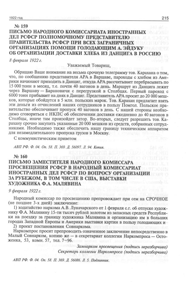 Письмо заместителя народного комиссара просвещения РСФСР в народный комиссариат иностранных дел РСФСР по вопросу организации за рубежом, в том числе в США, выставки художника Ф.А. Малявина. 9 февраля 1922 г. // АВП РФ. Ф. 04. Oп. 58. П. 369. Д. 56086. Л. 5. Подлинник.