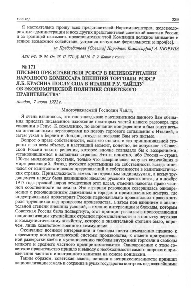 Письмо представителя РСФСР в Великобритании народного комиссара внешней торговли РСФСР Л.Б. Красина послу США в Италии Р.У. Чайлду об экономической политике советского правительства. 7 июня 1922 г. // АВП РФ. Ф. 0528. Oп. 1. П. 7. Д. 45. Л. 15-26. Копия.
