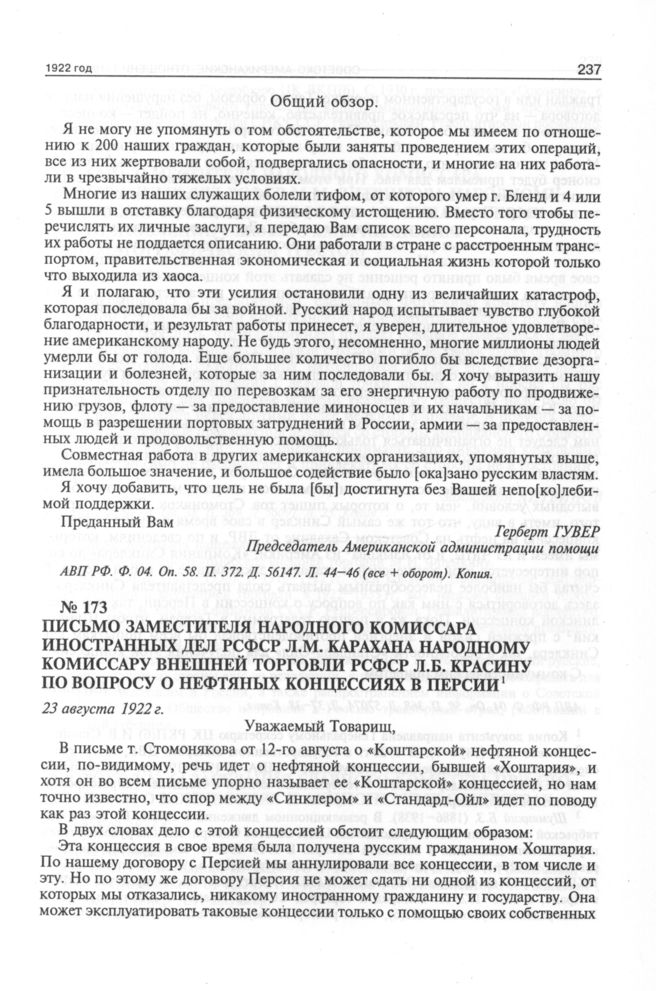 Письмо заместителя народного комиссара иностранных дел РСФСР Л.М. Карахана народному комиссару внешней торговли РСФСР Л.Б. Красину по вопросу о нефтяных концессиях в Персии. 23 августа 1922 г. // АВП РФ. Ф. 04. Oп. 58. П. 368. Д. 57074. Л. 37-38 Копия.