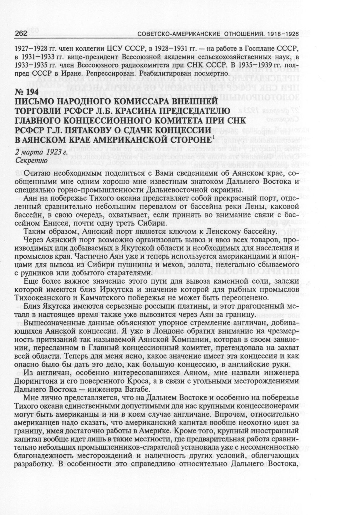 Письмо народного комиссара внешней торговли РСФСР Л.Б. Красина председателю Главного концессионного комитета при СНК РСФСР Г.Л. Пятакову о сдаче концессии в Аянском крае американской стороне. 2 марта 1923 г. // АВП РФ. Ф. 04. Oп. 58. П. 370. Д. 56099. Л. 82-83. Копия.