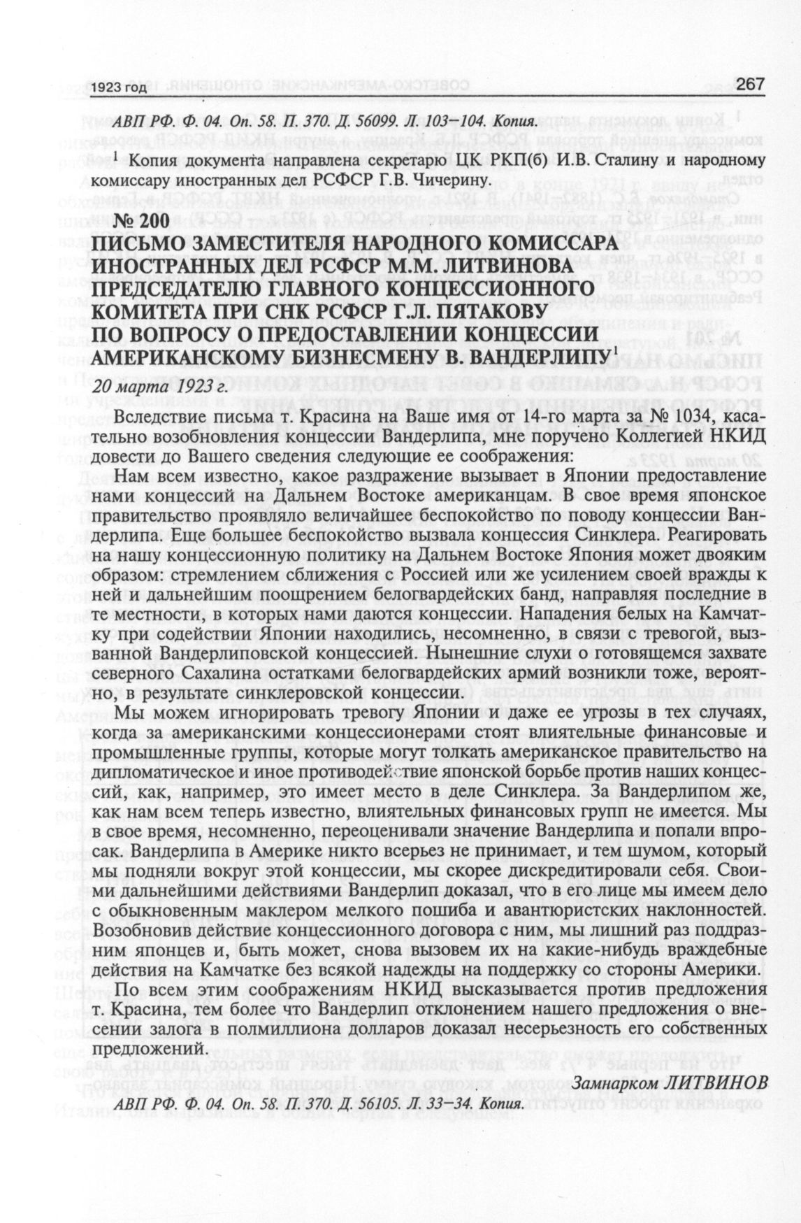 Письмо заместителя народного комиссара иностранных дел РСФСР М.М. Литвинова председателю Главного концессионного комитета при СНК РСФСР Г.Л. Пятакову по вопросу о предоставлении концессии американскому бизнесмену В. Вандерлипу. 20 марта 1923 г. // АВП РФ. Ф. 04. Oп. 58. П. 370. Д. 56105. Л. 33-34. Копия.