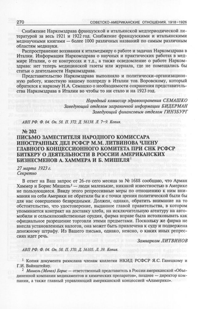 Письмо заместителя народного комиссара иностранных дел РСФСР М.М. Литвинова члену Главного концессионного комитета при СНК РСФСР Биткеру о деятельности в России американских бизнесменов А. Хаммера и Б. Мишеля. 27 марта 1923 г. // АВП РФ. Ф. 04. Oп. 58. П. 370. Д. 56105. Л. 39. Копия.