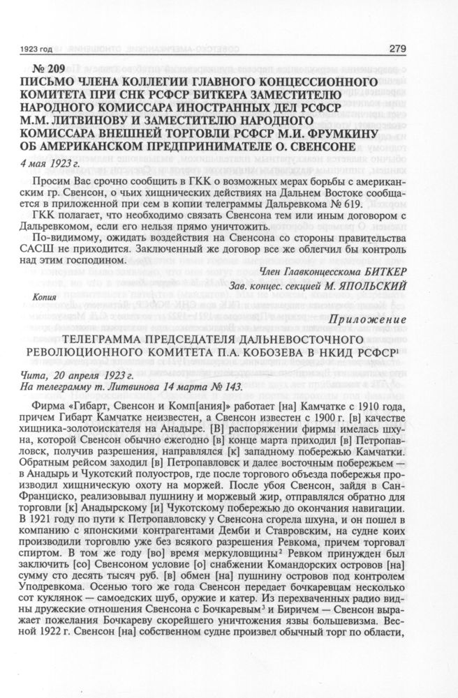 Письмо члена коллегии Главного концессионного комитета при СНК РСФСР Биткера заместителю народного комиссара иностранных дел РСФСР М.М. Литвинову и заместителю народного комиссара внешней торговли РСФСР М.И. Фрумкину об американском предпринимателе О. Свенсоне. 4 мая 1923 г. // АВП РФ. Ф. 04. Oп. 58. П. 370. Д. 56100. Л. 35, 36 + оборот. Копия.