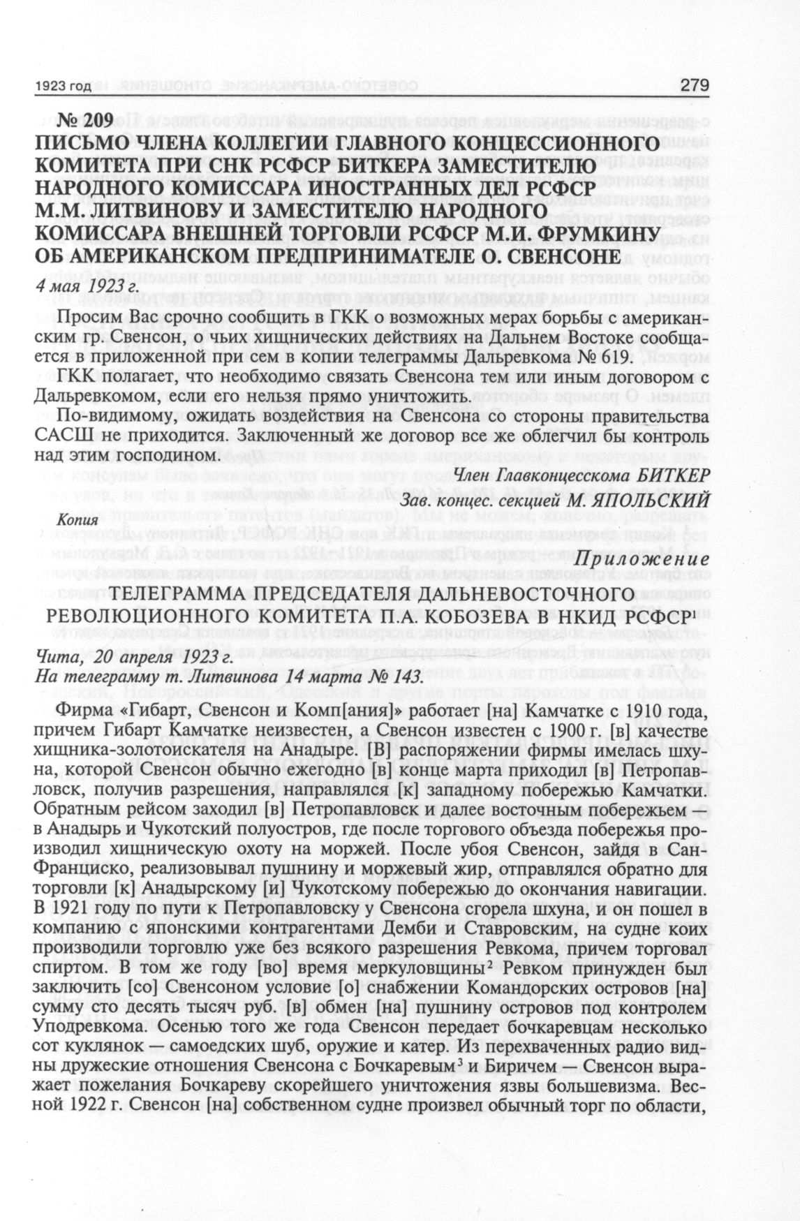 Письмо члена коллегии Главного концессионного комитета при СНК РСФСР Биткера заместителю народного комиссара иностранных дел РСФСР М.М. Литвинову и заместителю народного комиссара внешней торговли РСФСР М.И. Фрумкину об американском предпринимателе О. Свенсоне. 4 мая 1923 г.