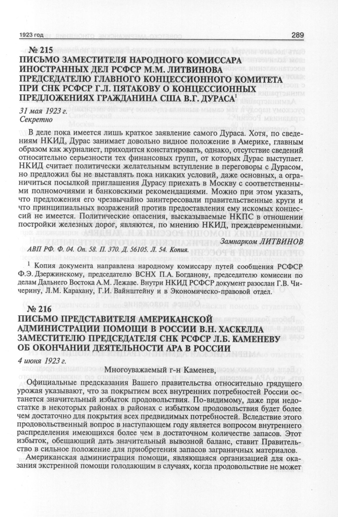 Письмо представителя Американской администрации помощи в России В.Н. Хаскелла заместителю председателя СНК РСФСР Л.Б. Каменеву об окончании деятельности АРА в России. 4 июня 1923 г. // АВП РФ. Ф. 04. Oп. 58. П. 373. Д. 56145. Л. 115. Копия.