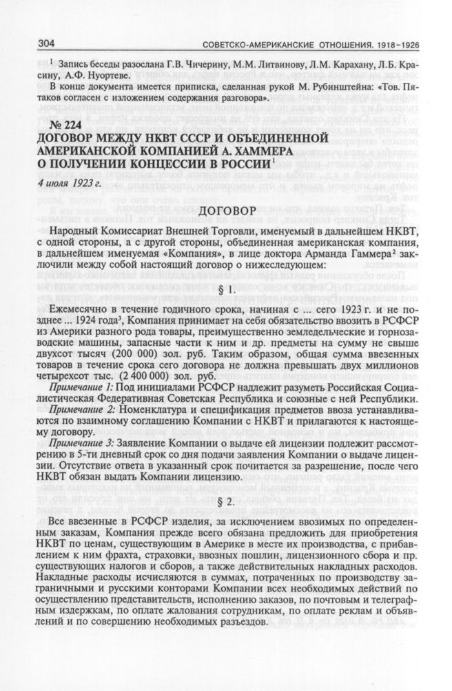 Договор между НКВТ СССР и Объединенной американской компанией А. Хаммера о получении концессии в России. 4 июля 1923 г. // АВП РФ. Ф. 04. Oп. 58. П. 371. Д. 36110. Л. 40-46. Копия.