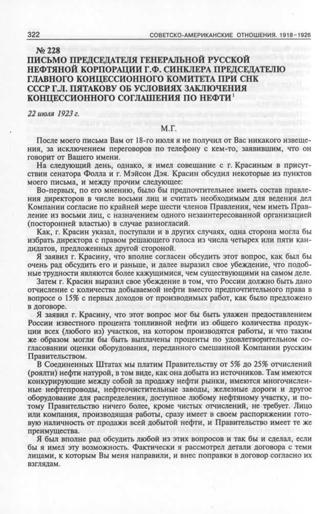 Письмо председателя Генеральной русской нефтяной корпорации Г.Ф. Синклера председателю Главного концессионного комитета при СНК СССР Г.Л. Пятакову об условиях заключения концессионного соглашения по нефти. 22 июля 1923 г. // АВП РФ. Ф. 04. Oп. 58. П. 371. Д. 56115. Л. 90-93. Копия.