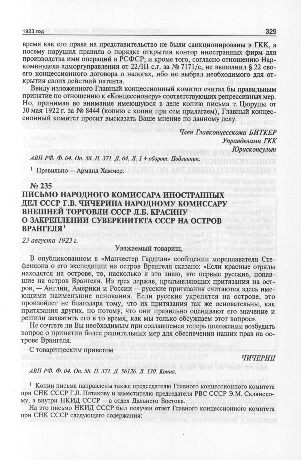 Письмо народного комиссара иностранных дел СССР Г.В. Чичерина народному комиссару внешней торговли СССР Л.Б. Красину о закреплении суверенитета СССР на остров Врангеля. 23 августа 1923 г. // АВП РФ. Ф. 04. Oп. 58. П. 371. Д. 56126. Л. 130. Копия.